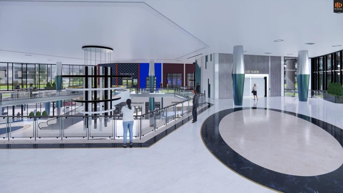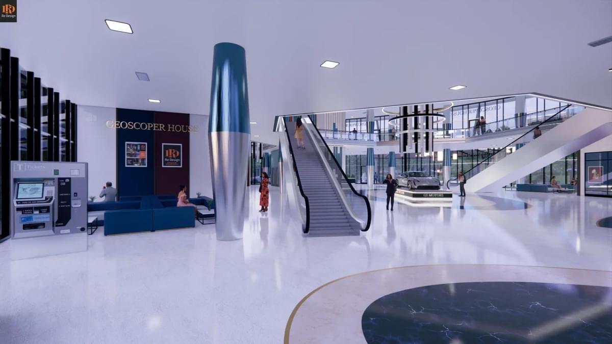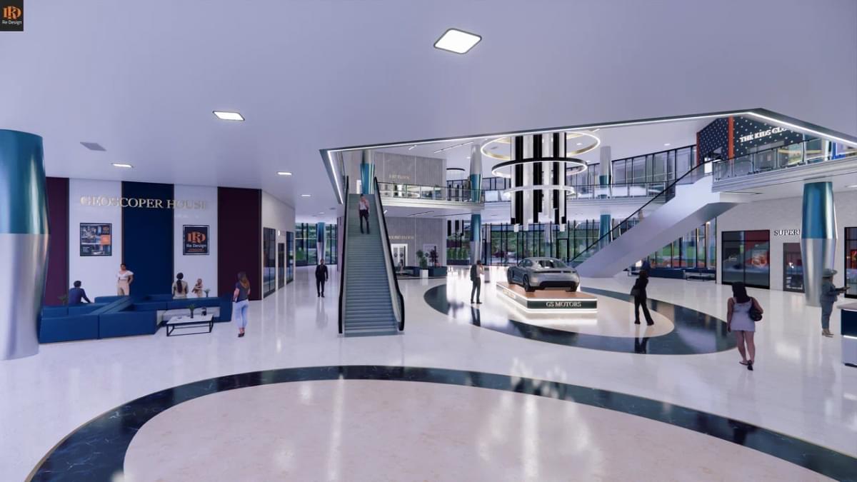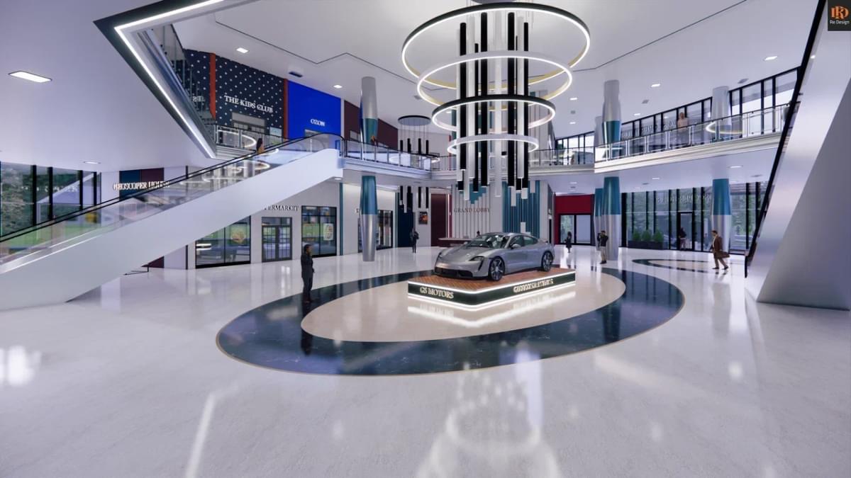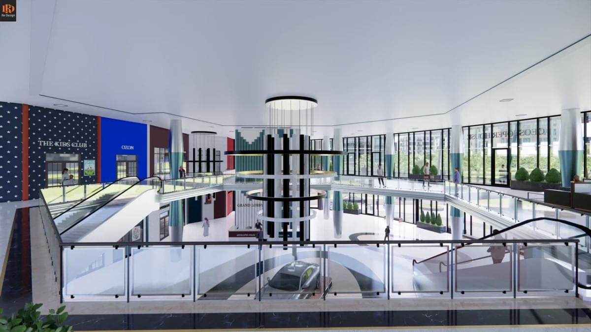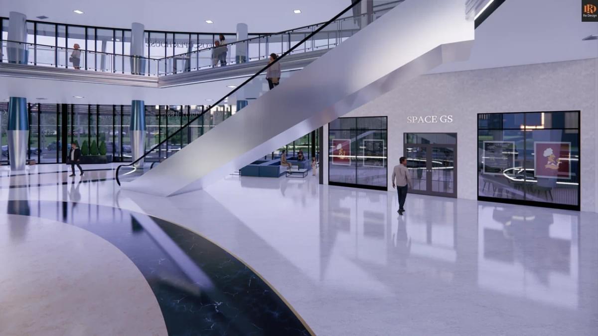 В качестве коммерческой составляющей, в зоне центрального атриума (вместо фонтана) смонтирован демонстрационный стенд автосалона “GS motors” и габаритные ворота для быстрой смены экспозиции слева от северного подъезда.