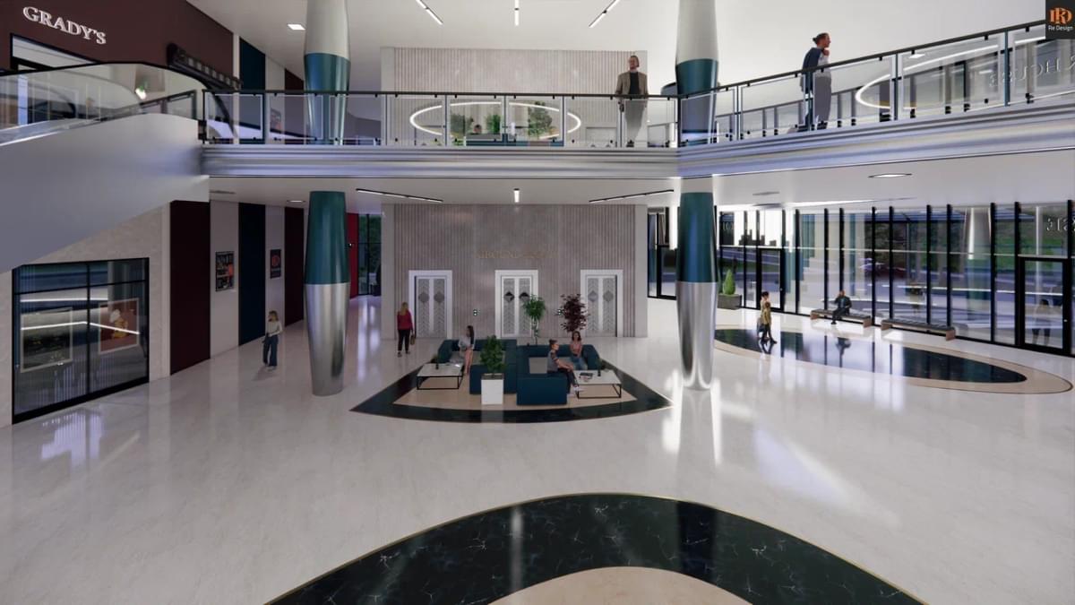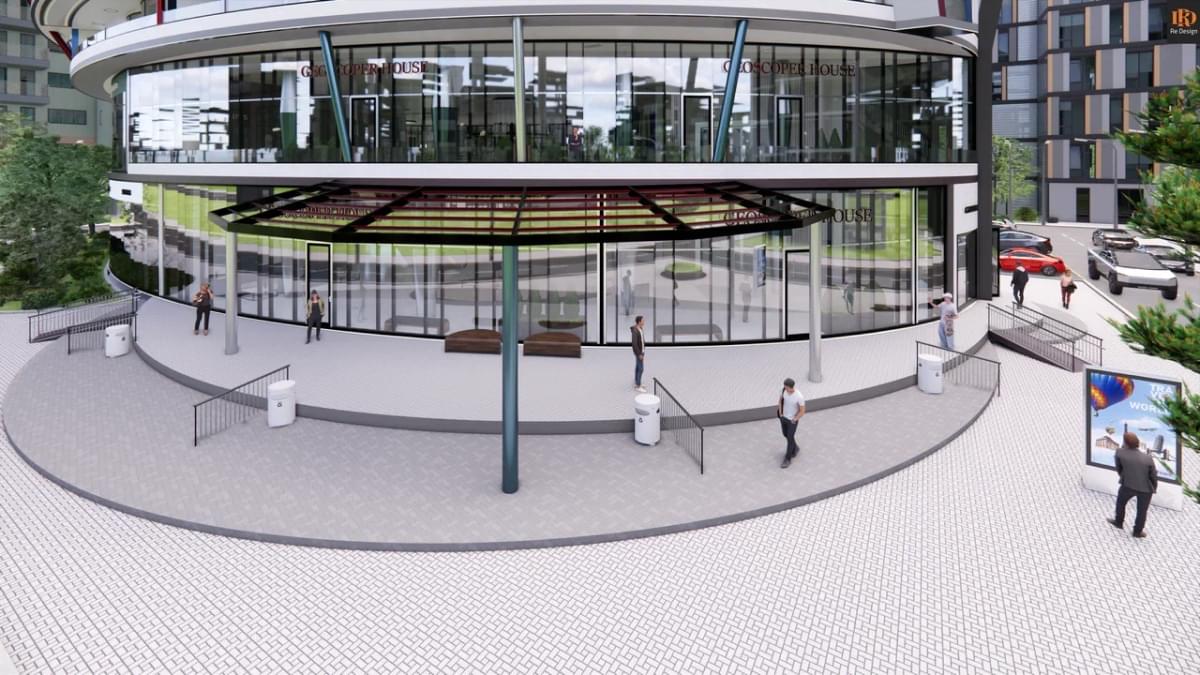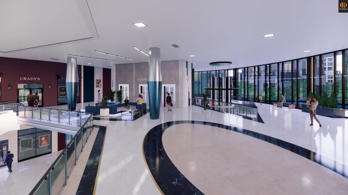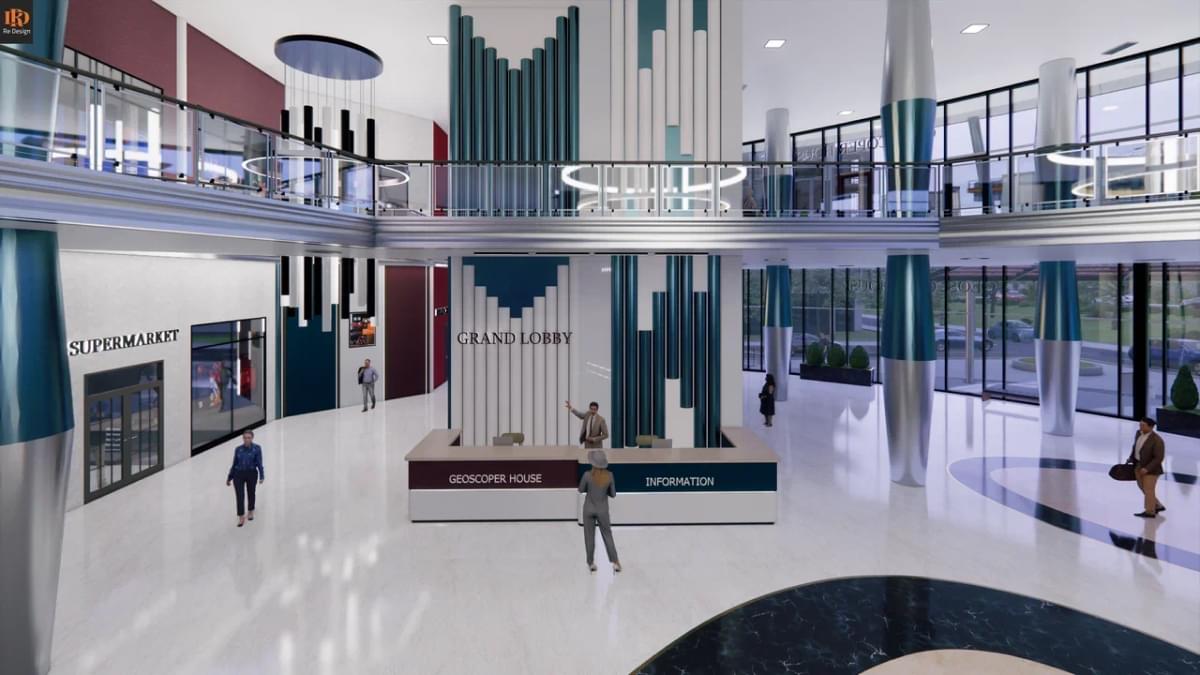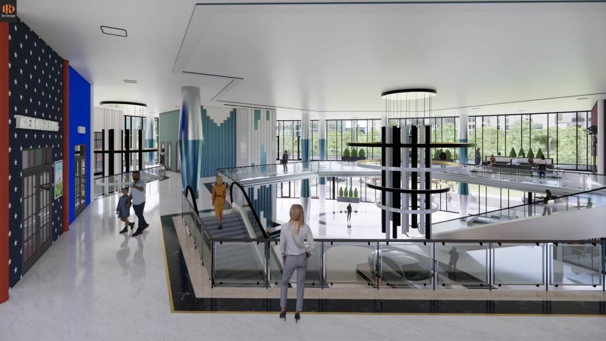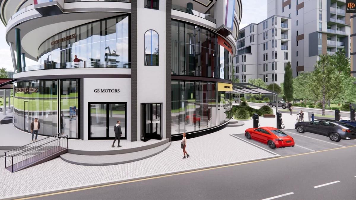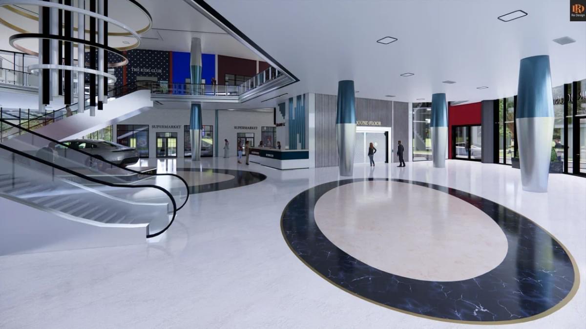 В качестве коммерческой составляющей, в зоне центрального атриума (вместо фонтана) смонтирован демонстрационный стенд автосалона “GS motors” и габаритные ворота для быстрой смены экспозиции слева от северного подъезда.
