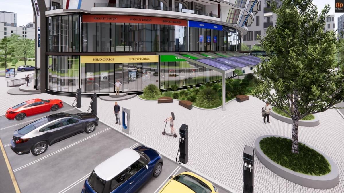 Мини-супермаркет - 107,2 м2, кафе “Space GS” - 131.1 м2, магазин освещения “New Light” - 31,4 м2, офис станции зарядки электромобилей “Helio Charge” - 24 м2, стойка ресепшен, технические и рекреационные зоны.