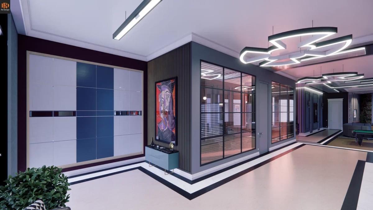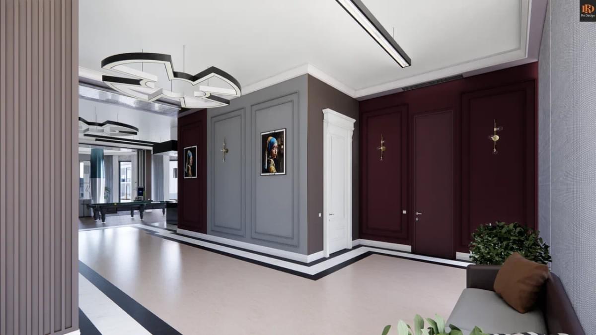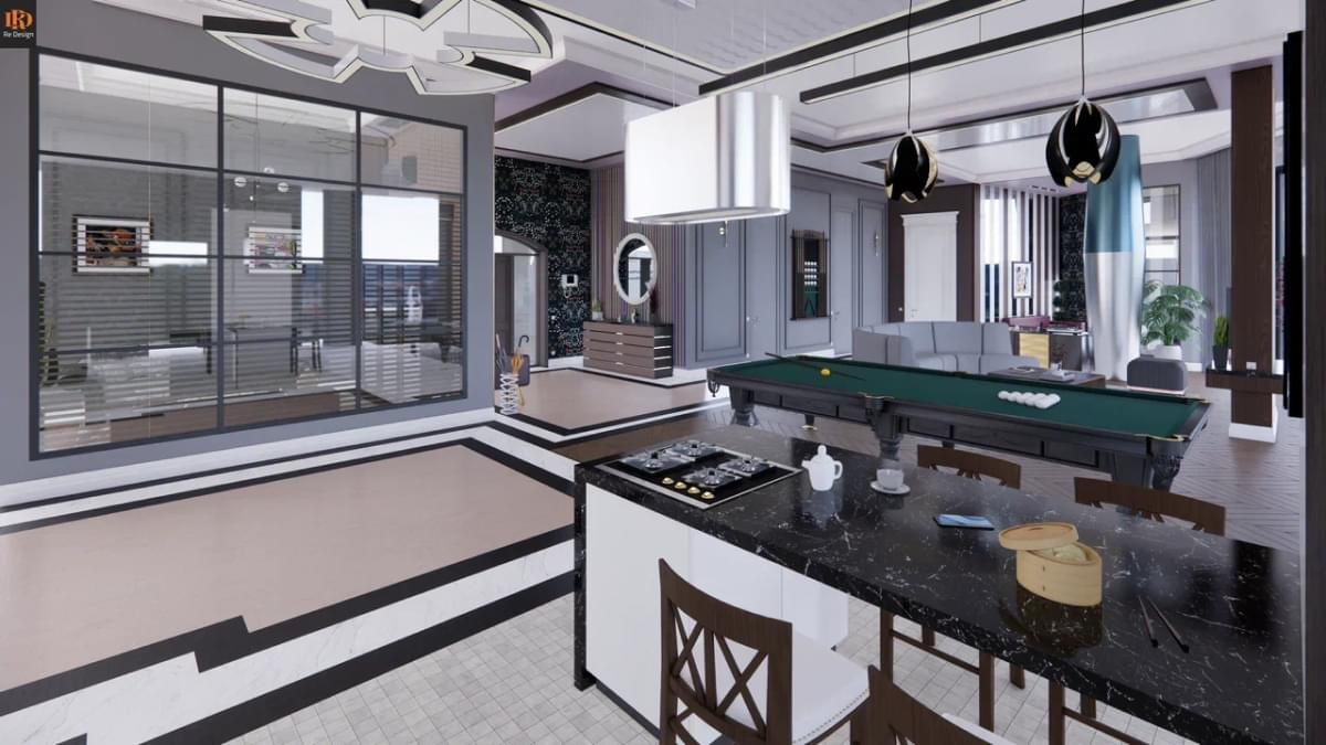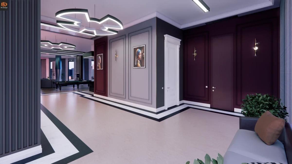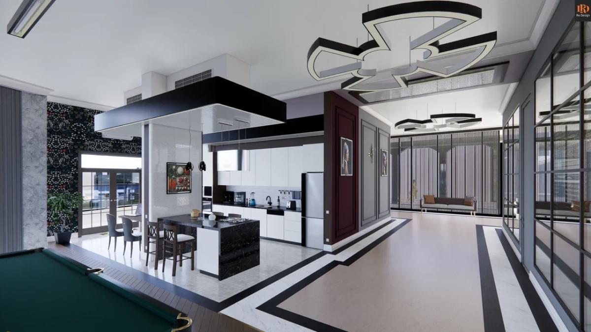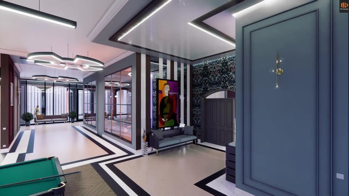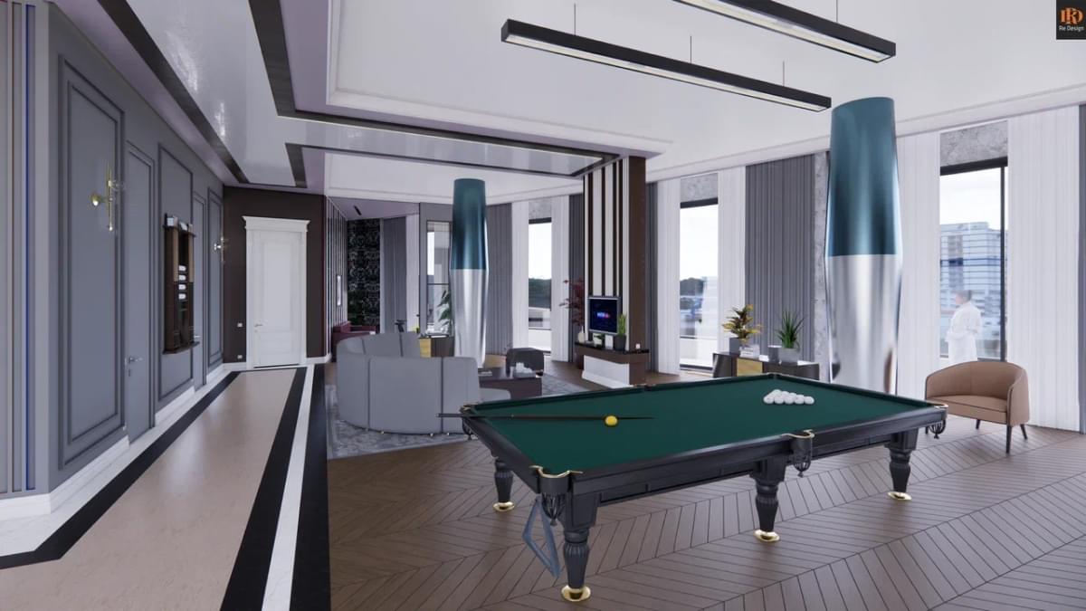 Общая зона студийного плана 210 м2 содержит ряд необходимых объединенных компонентов: прихожую 33,5 м2, кухню 26,7 м2, тренажерный бокс 10,6 м2, центральный коридор, гостиную с большим диваном и двенадцатифутовым столом для русского бильярда.
