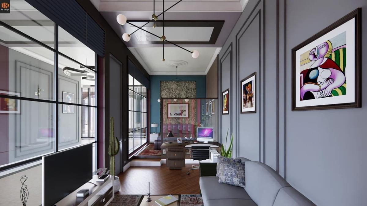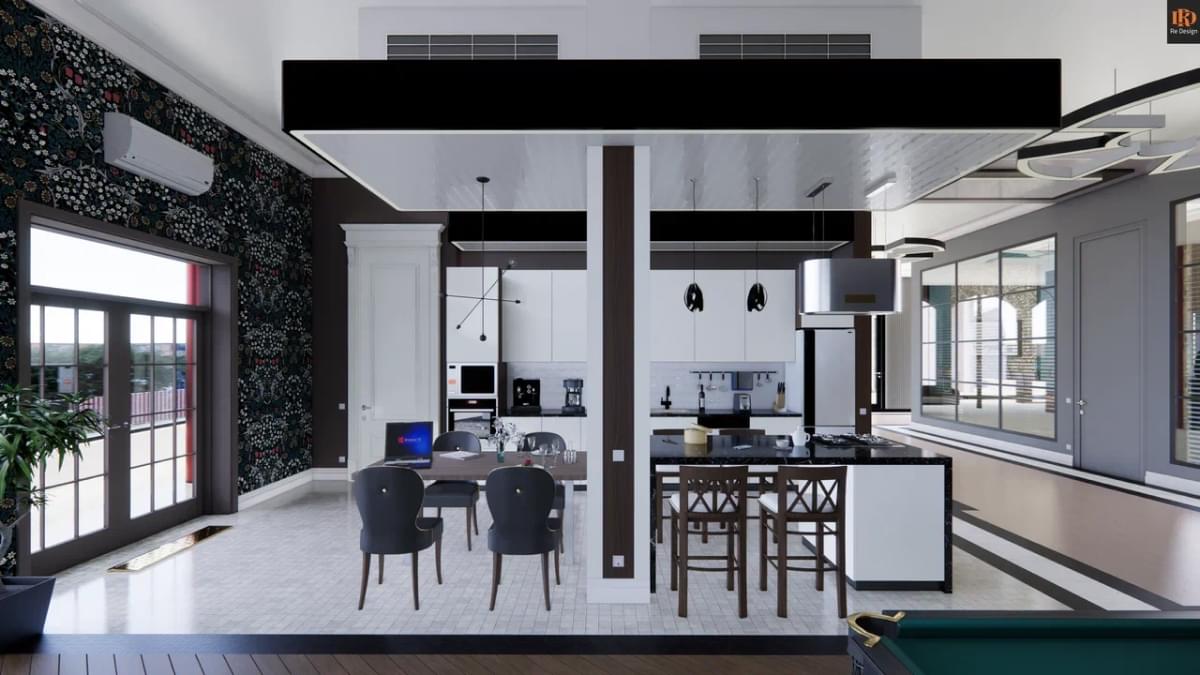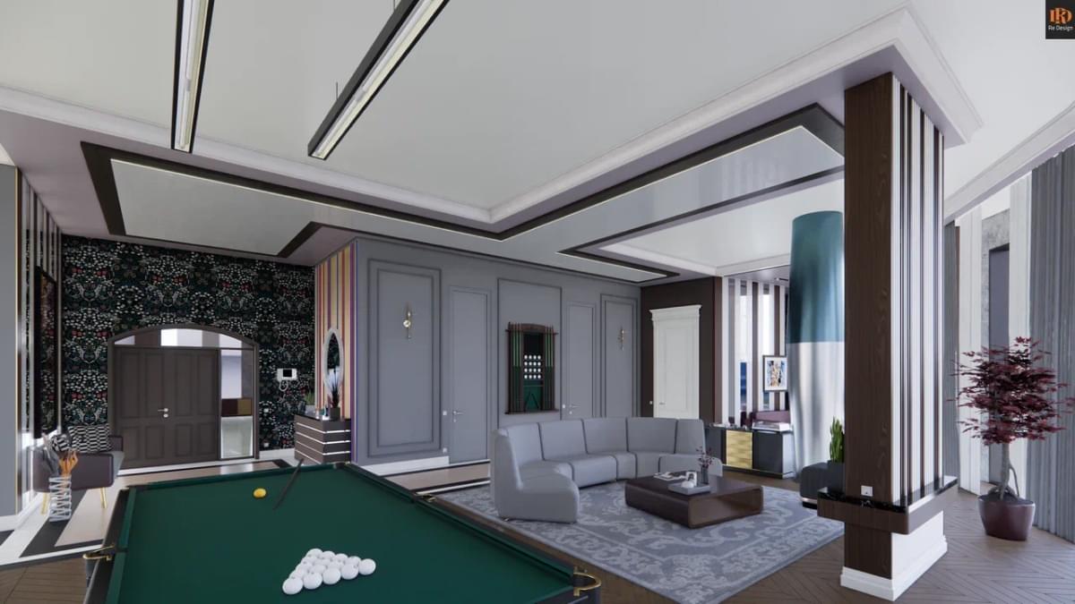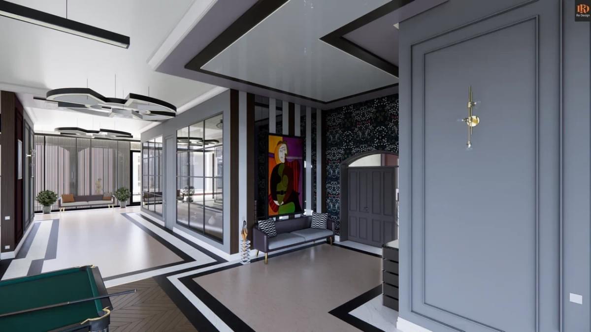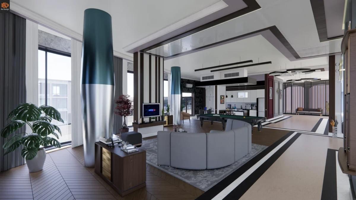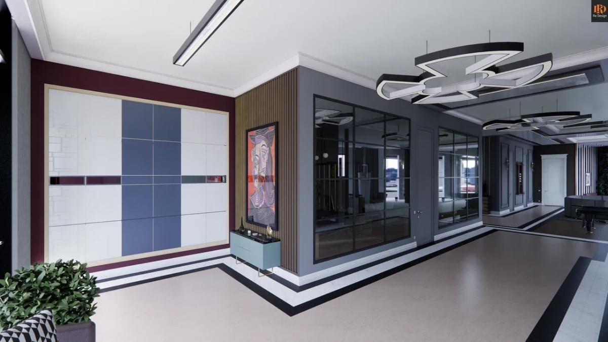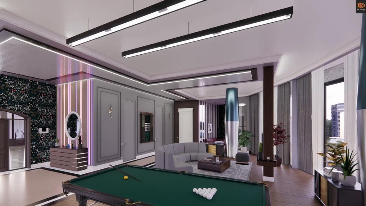 Общая зона студийного плана 210 м2 содержит ряд необходимых объединенных компонентов: прихожую 33,5 м2, кухню 26,7 м2, тренажерный бокс 10,6 м2, центральный коридор, гостиную с большим диваном и двенадцатифутовым столом для русского бильярда.