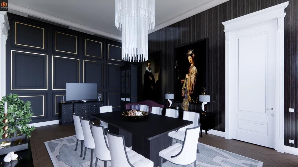 В качестве главного контрастирующего различия мы предложили межкомнатные двери высотой 3,2 м. - противопоставив массивные филенчатые порталы в стиле Ампир, более популярным полотнам скрытого монтажа без наличника* (под окраску). На наш взгляд подобный микс выглядит весьма впечатляюще.