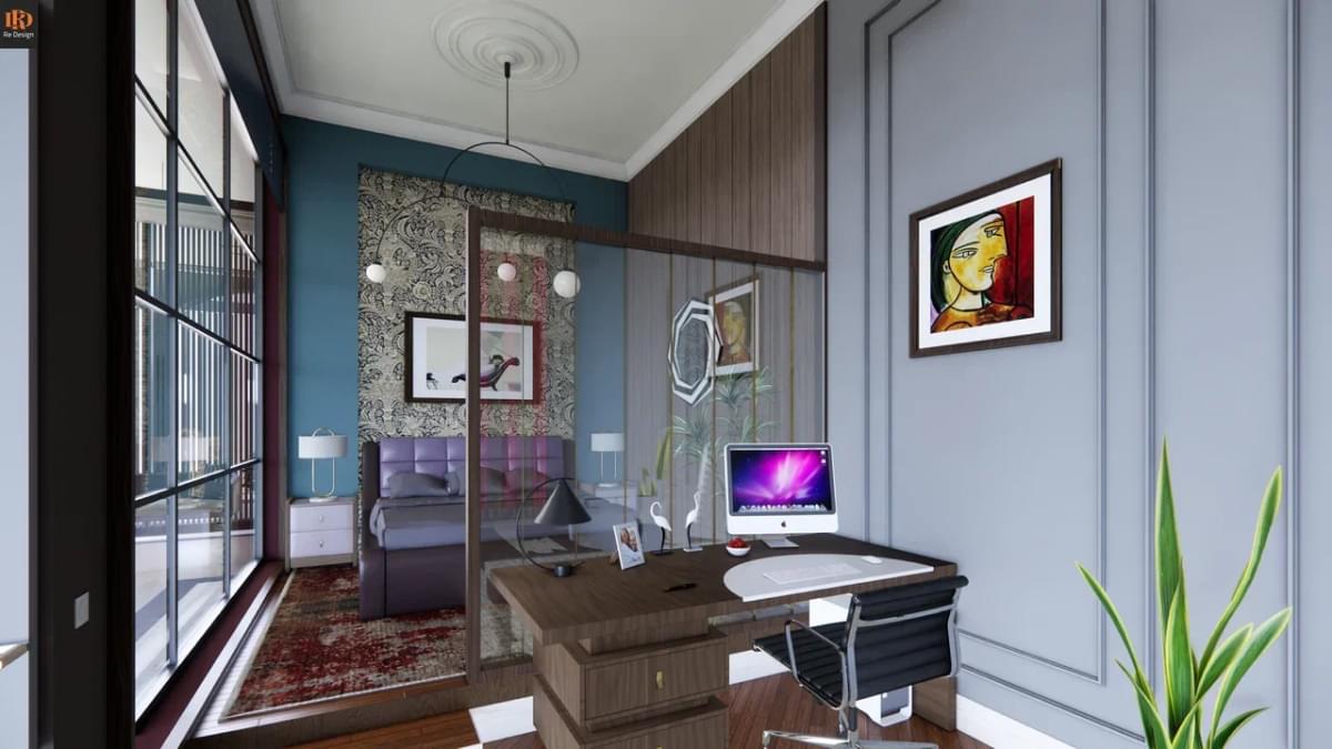 Для проникновения дневного света, в гостевой комнате 26 м2 без окон* мы установили две застекленные перегородки с плотными жалюзи (на электроприводе) изнутри. Помещение звукоизолировано и несмотря на компактные размеры, включает стационарную двуспальную кровать на подиуме 150 мм, компьютерный стол, место для трех книжных шкафов, раскладного дивана и комода с телевизором.