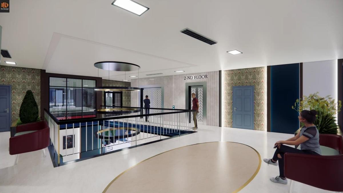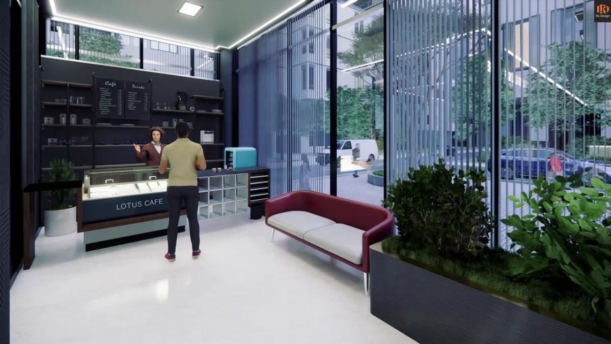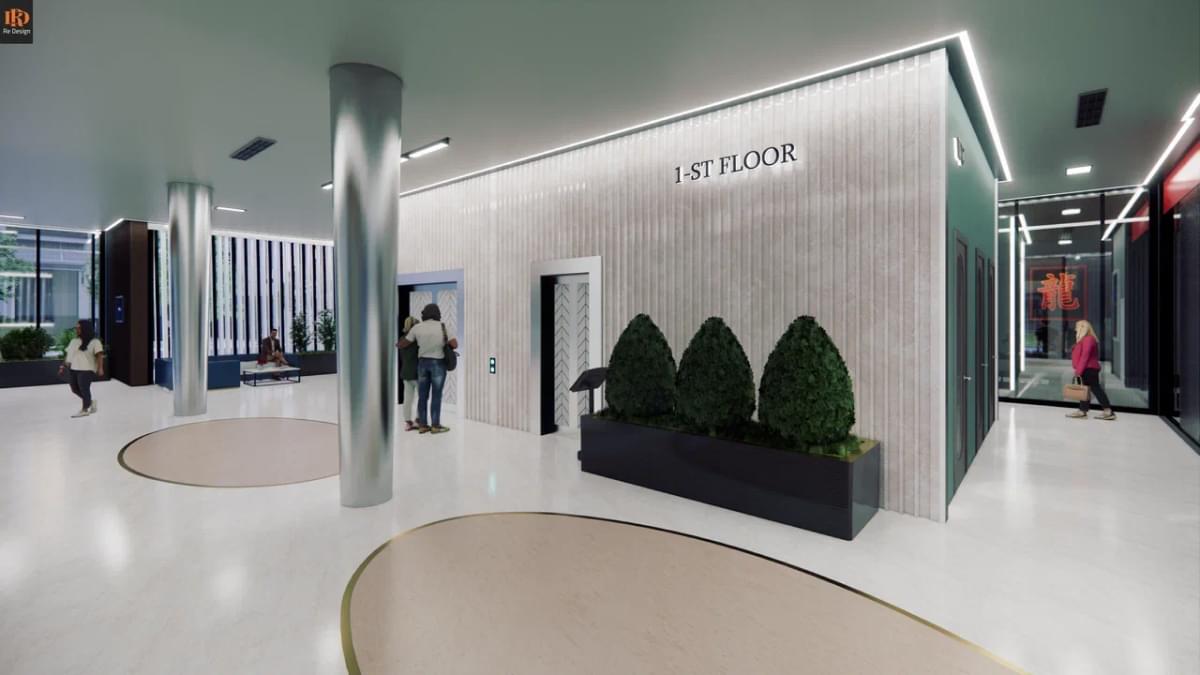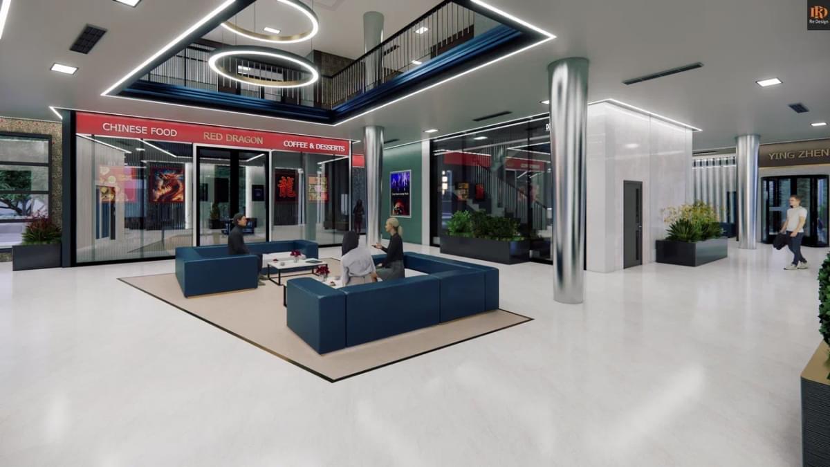 На первом этаже 630 м2 с “двойным светом” (высотой потолка 4 м.) и пятью отдельными выходами размещены: 2 зоны Reception 19 и 36 м2, китайский ресторан “Red Dragon” 94 м2 (с прилегающей кухней 18 м2), кафетерий “Lotus” 27 м2, рекреационные пространства свободной планировки с диванами (в северном крыле и напротив лифтовых холлов) и туалеты для гостей (в том числе для инвалидов).